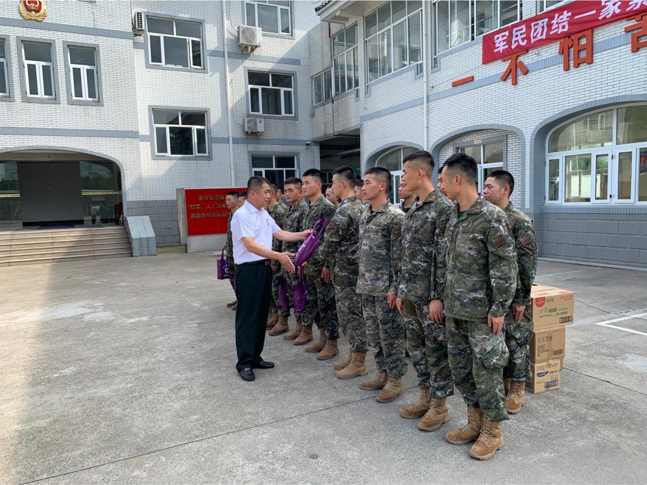 7月24日,江吟一行来到上海武警某部一大队一中队,实地观摩了官兵的实操训练和生活情况,并为官兵送来了饮料、水果和日常用品等慰问物资,向武警官兵致以节日的慰问和美好的祝福。此次慰问活动,以“军民团结一家亲、共庆‘八一’建军节”为主题,得到了浦东新区退役军人事务局的大力支持,庄沈芳副局长和就业安置处于大鹏处长亲自出席慰问活动并参加座谈。庄沈芳副局长在座谈中表示,将一如既往地支持国防和军队建设,并对恒信和众保安集团在双拥工作中所做的积极贡献给予充分肯定。